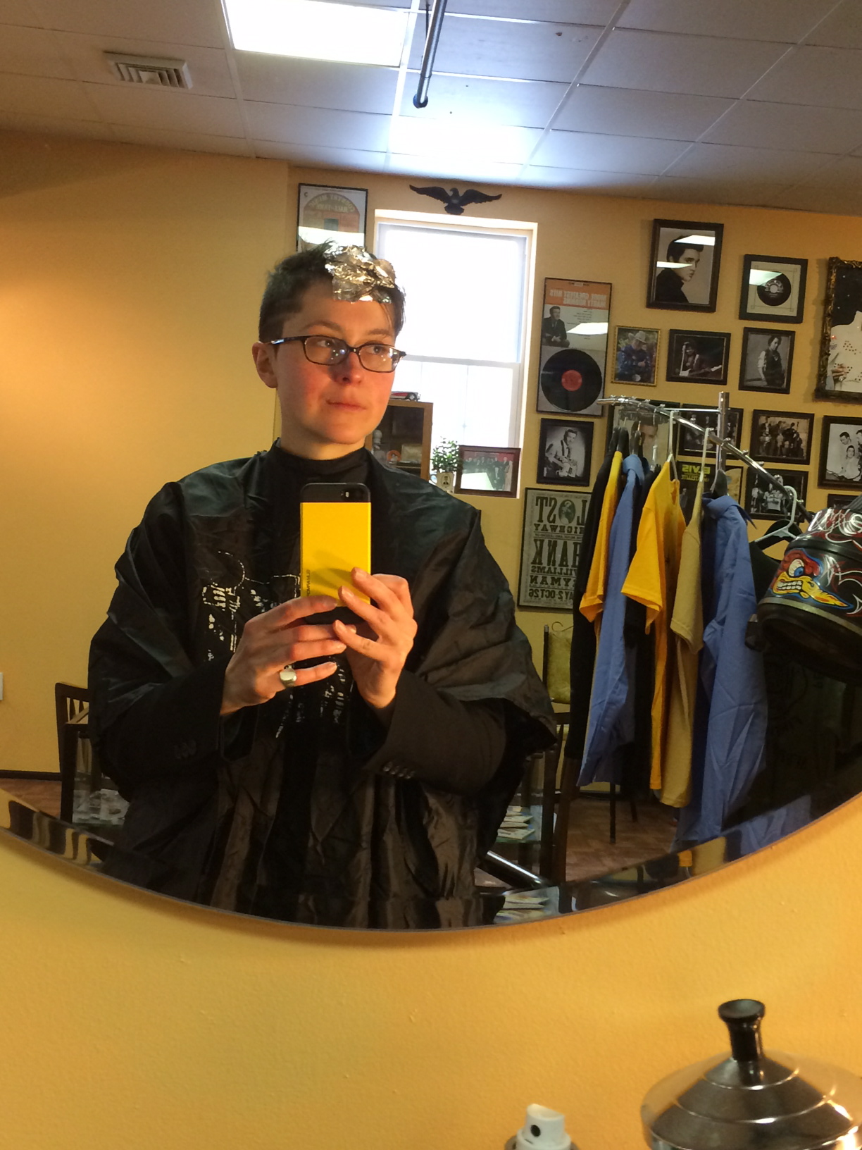That being said, ya’ll should drop by for a cut! The owner has good taste too, CLEARLY, as he showed me a pic of himself when he was my age, sporting my exact hairdo, and dyed green. I must also confess now, and I aint afraid to say it, I got myself a little crush on the gal who colored my hair 🙂 Me think it a good place for a punk organist to tend to her style…