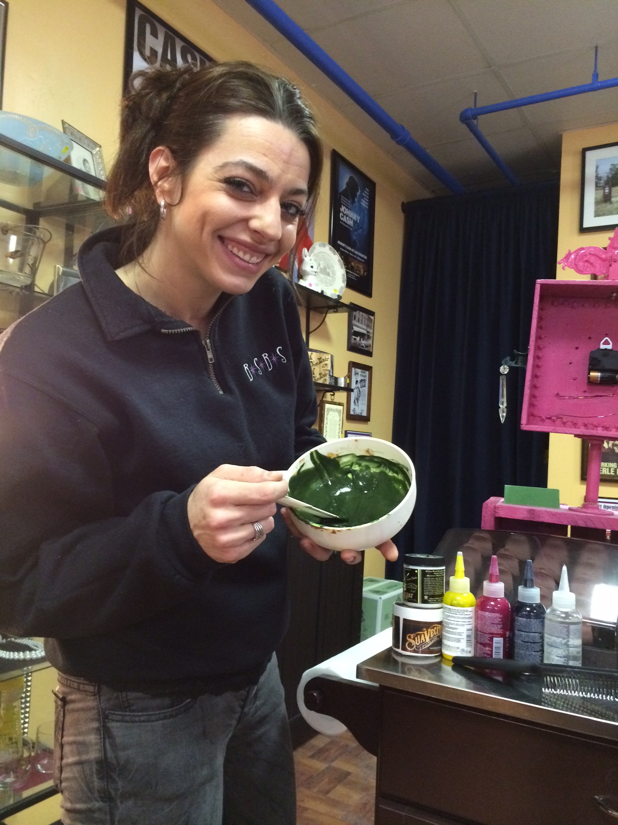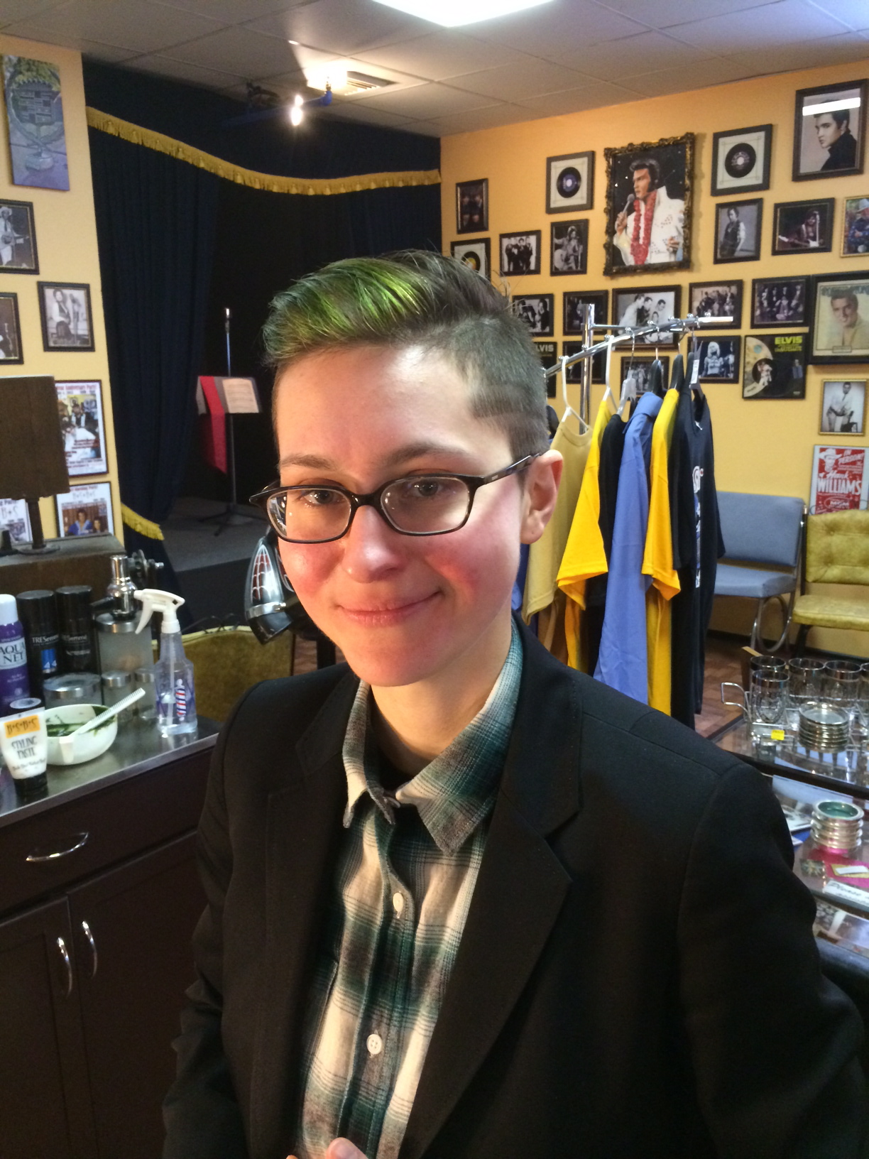 Beale Street Barber Shop is a cool little shop to get your chop on, located in Peekskill, NY, that styles itself rocka-billy, honky-tonk, and all that jazz. While I dont care for the music that resounds from within, ie Sinatra, Elvis, etc, that’s OK. The owner Mark, and stylist Mary, are very friendly folk, indeed, and Mark is a musician in his own right. Today, I showed up to liven my hair up a bit. I had a patch of green put in the front, and Mary did a wonderful job! I’ve been very pleased with the work they do here, overall, with past haircuts etc. She did a great job of mixing up a nice color green for me, and was a lot of fun to talk to, as we discussed all manner of scientific thought, clearly geared towards our eventual plan to take over the world. Even though we only met for the first time 2 weeks ago.